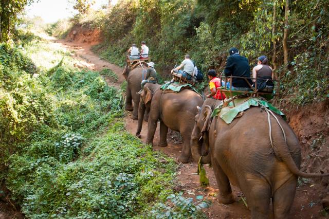 Neyse, ben daha önce Sri Lanka’dayken üzerinde yalnızca battaniye olan bir file binmiştim ve fil yürüdükçe oynayan kemiklerini bacaklarımda hissedip acayip huylanmıştım; dolayısıyla başta bu gözüme çok korkutucu gelmedi ama hayvana binmek icin iki katlı bir barakanın üzerine tırmanmamız gerekince yine ürktüm ve binmemeye karar verdim. Neyse, tabii ki son anda bir gazla bindim de pişman olmaktan kurtardım 🙂 Tabii ki yine çok çok korktum çünkü Sri Lanka’dakinin aksine burada parkur düz değildi: Dik rampalar, yokuş aşağı patikalar, kayalıklı dereler geçtik. Yaklaşık yarım saat süren gezintinin ilk yarısını tamamen kasarak ve gözlerimi yumarak geçirdim, daha sonra ise yavaş yavaş alıştım ama yine de benim için biraz ürkütücü bir deneyimdi.