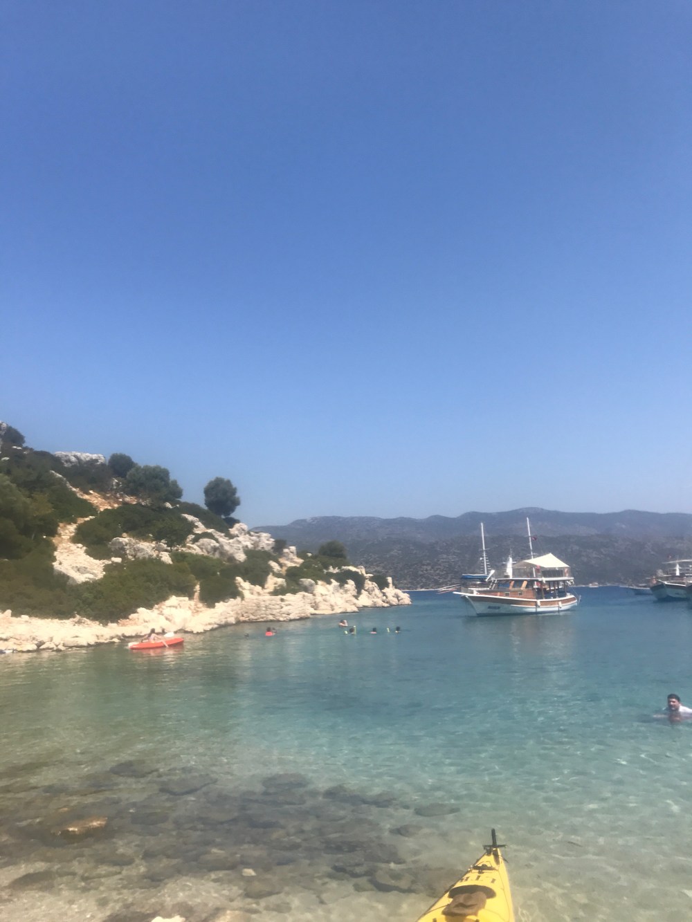 Simdi biz Ucagiz Koyu’nden basladik, ilk hedef Tersane Koyu. Buraya kadar yaklasik 45 dk suruyor. Sonra kayaga henuz yeni yeni alismis kollarinizi tasiyan nazli bedenlerinizi o guzelim suya birakip soyle bir “Ohhh” cekiyorsunuz.