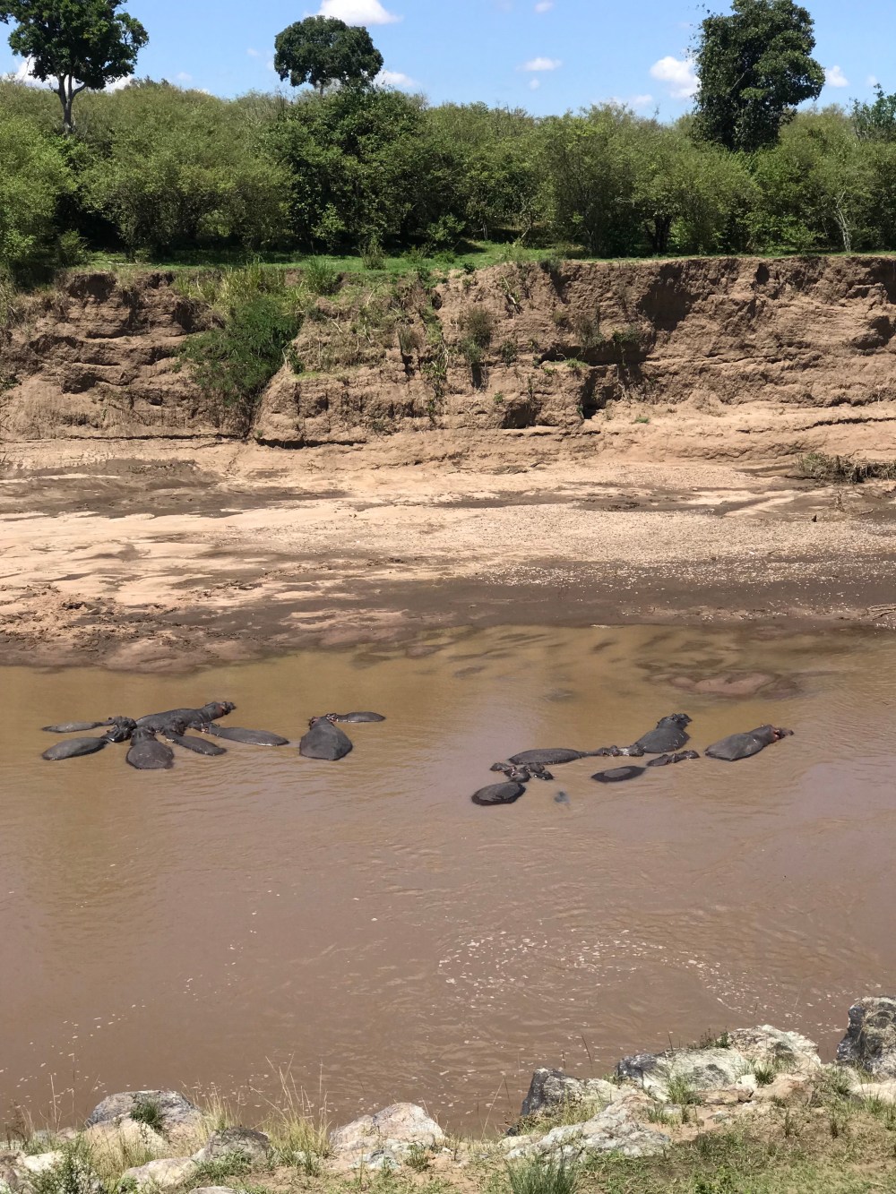Mara nehri Kenya-Tanzanya sinirinin yakininda. Bir yaninda onlarca zebra, zurafa, impala besleniyorlar, nehrin kiyisinda ve icinde ise hipopotamlar camis gibi yatiyor 🙂 Cok komik hayvanlar, biri sirt ustu nehir kiyisinda, biri suyun icinde sifir hareket, uzerlerine kucuk kuslar konup takiliyorlar, oyle acayip relax bir ortam. Sonra zor bela bir timsah gorduk; o da suyun icinde kayboldu. Cok urkutucu bir hayvan, suya gomuldugu an esamesi okunmuyor, sonra yuzeye yakin dikey bir cizgi halinde suzuldugunu goruyorsunuz.