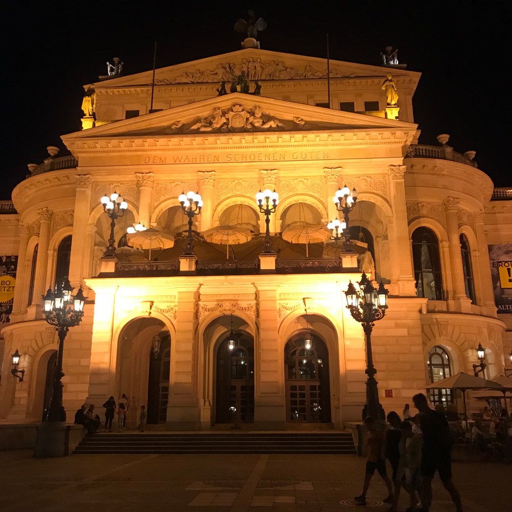 Buraya kadar gelmisken Frankfurt merkeze ugramamis olmayalim dedigimiz icin yorgunluktan bitap dusmemize ragmen otele ugrayip uzerimizi degistirip merkeze attik kendimizi (Tabii cok temkinli ve keyif duskunu oldugumuz icin once odamizda cay ve kendimiz yaptigimiz sandviclerimizi hupletip enerji topladik). Taksiye atlayip direkt Alter Oper’e, yani opera binasina gittik. Muhtesem isiklandirmasiyla opera binasi gercekten cok gorkemli. Oradan Zeil caddesine yuruyup, Romerberg meydanina devam ettik. Romerberg meydani, Orta Cag’dan kalmis ve dunya mirasi olarak korunmaya alinmis bir yer. Burayi da soyle bir gordukten sonra donus yolunda gordugumuz bir pub’a oturup guzel hava esliginde gecenin tadini cikardik.