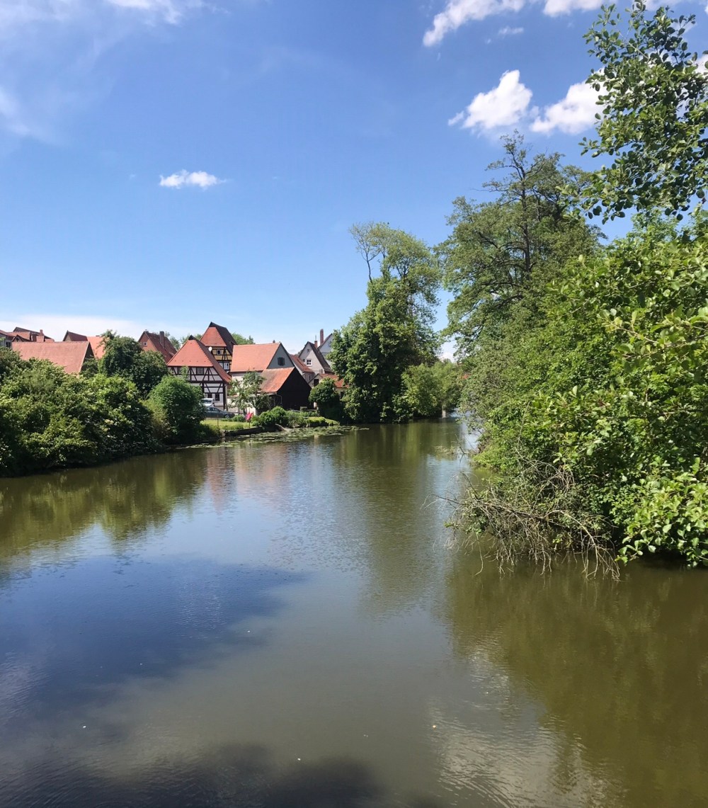 Nördlingen’de beni en cok etkileyen sey su asagida fotografini gordugunuz romantik manzara oldu. Sakince iki yakayi birbirine baglayan bir irmak, iki yemyesil kiyi, uzaklarinda artik gormeye alistigimiz guzellikteki su evler…